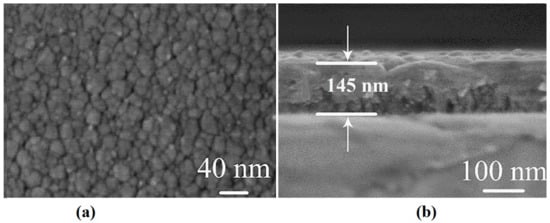 (a) SEM surface image, (b) SEM cross-section image with the thickness.