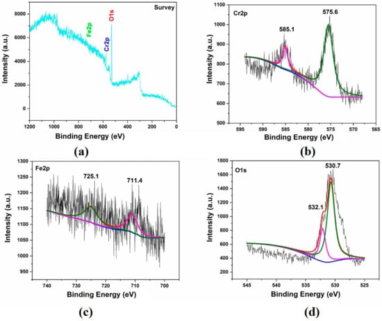 As shown in Figure 5, characteristic peaks of coating components were analyzed by XPS. Figure 5a shows the coating Fe2P Cr2P and the core level of O1s XPS through an XPS peak-differentiation-imitating analysis. Cr2P observed component peaks of different intensities, attributed to the oxygen peak of the primary lattice and the formation of hydrates, as shown in Figure 5b. In Figure 5c, Fe2P displays various oxides such as Fe2O3, Fe3O4 or FeO. In Figure 5d, the O1s peak has a shoulder at the higher binding region due to the primary lattice oxygen peak and the inherent characteristics of the O1s of spinel or defective oxide components inherent in these composite oxide surfaces.