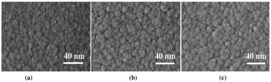 The surface morphology of the coating was observed by scanning electron microscopy (SEM). As shown in Figure 7, the coating surface features is densely packed nano-sized grains. It is worth noting that after the thermal shock test, the grain boundary becomes blurred and a more compact structure with some particles distributed on the surface is formed. It is speculated that the changes of oxide hydrate in the coating during the frequent thermal shock test lead to the changes of the micro-morphology.