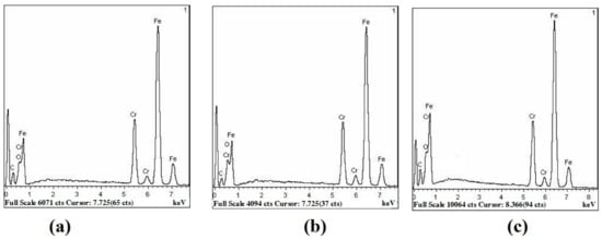 The physical properties of chromium-iron oxide have good heat resistance [29]. Figure 8 shows that the main component of the coating obtained by chemical coloring on the surface of the ultra-pure ferritic stainless steel is a chromium iron oxide mixture. Therefore, in the heat resistance test, the EDS spectrum of the coating is relatively stable compared with as-deposited, which is the internal reason for the small change in the solar absorption found in the test of Figure 6a.