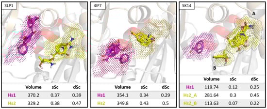 Overlap between FTMap probes (stick representation) and subpockets identified by DogSiteScorer (dots representation) using 3LP1, 4IF7 and 5K14 Site1 conformations. sSc: Site Score; dSc: Drug Score. Volume is expressed in Å.