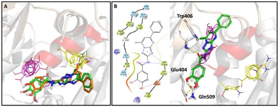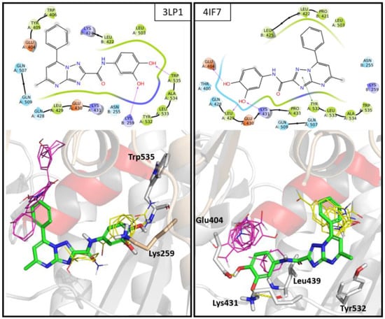 The predicted binding mode of derivative 18g as representative is reported in Figure 5. In this compound, the TZP core was able to orient the two aromatic rings into Hs1 and Hs2. In particular, the catechol moiety established two hydrogen bonds with Trp535 and Lys259 in Hs2 and the phenyl ring was placed into Hs1. Additionally, 18g established hydrophobic interactions with Tyr405, Gln428, Leu503, Gln507, Gln509 and Trp535. Interestingly, the predicted activity (Kipred) was in line with the experimental IC50 value (Kipred = 0.37 µM; IC50 = 0.4 µM; Table S2). By contrast, the 4I7F conformation provided binding poses for the analysed derivatives in which the C-2 catechol moiety was placed in Hs1 and the C-7 phenyl ring was oriented into Hs2. Even though the catechol moiety was involved in a complex H-bond network, Hs1 region defined by the FTmaps probes was only marginally occupied by the compound (Figure 5). Of note, no reliable pose was obtained for the active TZP derivative 17h.