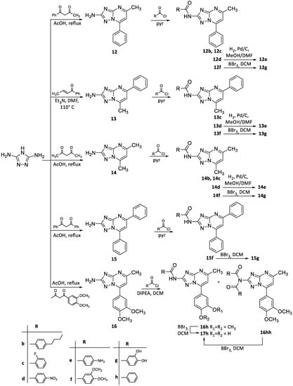 The synthesis of the 2-amino-1,2,4-triazolo[1,5-a]pyrimidine derivatives 12b–g, 13c–g, 14b–g, 15g, 16hh and 17h was accomplished starting with the preparation of the 2-amino synthons 12–16, as shown in Scheme 1. Synthons 12 [] and 13 [] were synthesized via reaction of 3,5-diaminotriazole with 1-phenylbutane-1,3-dione and 1-phenylbut-2-en-1-one, respectively []. Synthons 14 [] and 15 [] were prepared through a more efficient procedure than that already published, entailing the reaction of 3,5-diamino-1,2,4-triazole with the appropriate β-diketone in glacial acetic acid at reflux. Accordingly, by following the same procedure synthon 16 was also obtained. The successive amidation reaction of synthons 12–15 with the appropriate benzoyl chloride in dry pyridine afforded the target compounds 12b–d, 12f, 13c–d, 13f, 14b-d and 14f, respectively. Conversely, in the case of synthon 16, probably due to its low solubility in pyridine, the amidation reaction with benzoyl chloride was accomplished in dry freshly distilled DCM, in the presence of DIPEA, leading not only to compound 16h but also to the diamide derivative 16hh. The p-aminophenyl derivatives 12e, 13e, and 14e were then obtained by catalytic hydrogenation in presence of palladium on carbon of nitro precursors 12d, 13d, and 14d, respectively, while O-demethylation of dimethoxy derivatives 12f, 13f, 14f, 15f, and 16h was performed with BBr3 in DCM providing the corresponding dihydroxy derivatives 12g, 13g, 14g, 15g, and 17h, respectively. The same O-demethylation reaction conducted with compound 16hh did not furnish its corresponding 3,4-dihydroxyphenyl derivative, but led again to the monoamide derivative 17h.