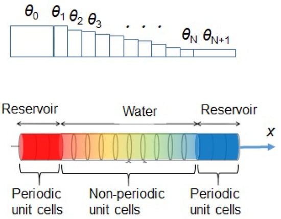 One-dimensional phonon model of reservoir-water-reservoir structure. Each unit cell j has length , () along the x-direction and temperature , (), where and [].