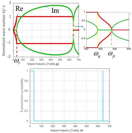 Figure 4. Complex dispersion curves (upper) and transmission probability spectrum of the phonon (lower). The upper right inset plots enlarged dispersion curves in the frequency range of 642–645 Trad/s.