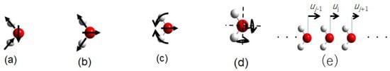 Figure 5 shows liquid-phase water motions [,] of (a) anti-symmetric stretching, (b) symmetric stretching, (c) bending, (d) libration, and (e) intermolecular vibration, respectively. In step 1, we determined wave numbers and as modes (b) and (e) from the maximum value of the experimental absorption spectrum shown in Figure 3, where we selected as maximum value of intramolecular vibration in the experimental spectrum because the absorbance of mode (b) was higher than that of mode (a) []. It is also noted that some other modes such as those associated with hydrogen bond stretch may be contained in the “libration” region (d) in Figure 3, while they are supposed to play an insignificant role in the present simplified model. This procedure is applicable not only to liquid water, but also to water in a wide range of solid, liquid, and gas temperatures []. Table 1 shows the wavenumbers and angular frequencies of various molecular vibrational modes of liquid water, where , , , , and are wavenumbers of liquid-phase water motions [,] of (a)–(e), respectively. Because of small difference between and , we have calculated as , where and are wave numbers of isolated water molecule 3756 cm and 3657 cm, respectively [].
