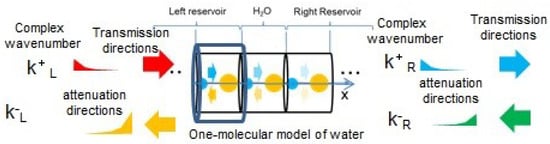as defined in Equation (A24) in Appendix A. The complex dispersion curves shown in the upper part of Figure 4 has three modes of acoustic wave, attenuation and optical wave as shown in Table 2. In this study, we have employed an interval of water molecule as 0.319 nm [] in Figure 2. We can calculate the transmission function by Equation (3a), and , and modes have the transmission probabilities of approximately 1, 0, 1 over angular frequency ranges of , , and , respectively, as shown in Table 2. Then we can depict the frequency characteristics of the transmission probability as shown in the lower part of Figure 4. The transmission probability takes not only discrete values of 0 or 1, but continuous values between 0 and 1 near the boundary angular frequencies of and .