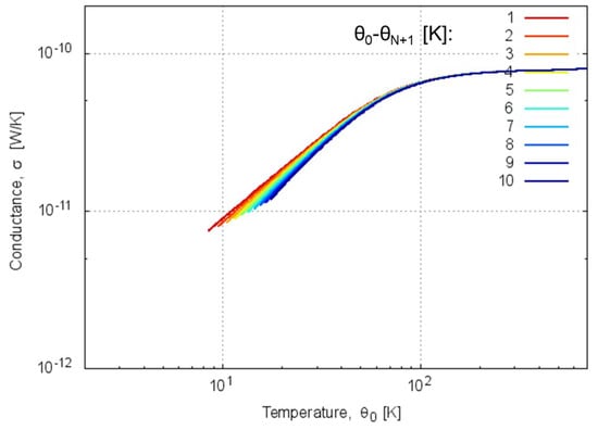 Temperature dependences of thermal conductance calculated by Equation (7). The parameters 1, 2, ⋯ 10 with unit of degrees Kelvin in the graph mean temperature differences between the left and right reservoirs.