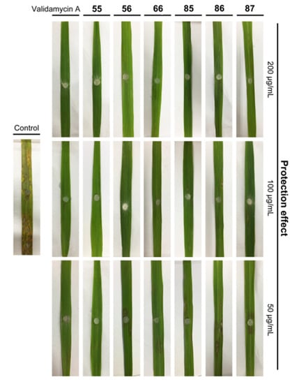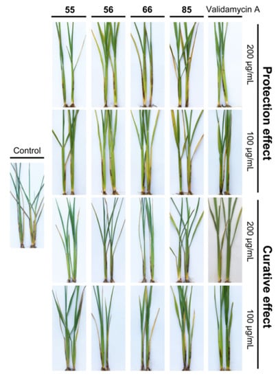 2.2.2. In Vivo Protective and Curative Effects against Rice Sheath Blight