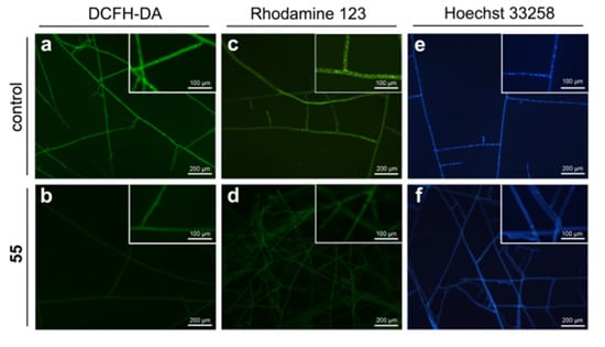 2.2.3. Effect of 55 on the Hyphae Morphology of R. Solani