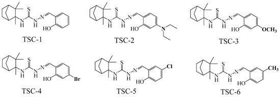 The six camphene-based thiosemicarbazone (TSC1-6) are depicted in Figure 1.