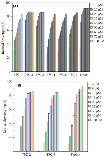 DPPH radical is a stable radical, and has an odd electron with a strong absorption band at 517 nm in ethanol solution. When the DPPH radical is reduced by acquiring an electron or hydrogen atom from the antioxidant, the color of DPPH alcohol solution turns from deep violet to pale yellow; meanwhile, the intensity of the absorption peak at 517 nm decreases [31]. As shown in Figure 2A, all of the compounds displayed appreciable DPPH radical scavenging activity, compared with Trolox. In the range of 10–100 µM, with the increasing concentration, the DPPH scavenging rate of TSC-1, TSC-4, TSC-5, and TSC-6 showed considerable dose-dependent activity and reached the maximum of about 83% at 100 µM. For TSC-2 and TSC-3, they showed higher scavenging activity at 25 µM, while with a further increase in concentration the scavenging rate did not show a significant change. Figure 2B shows that in the range of 4–25 µM, TSC-2 and TSC-3 showed dose-dependent activity. Among these compounds, TSC-2 and TSC-3 had more remarkable scavenging DPPH activity than others.