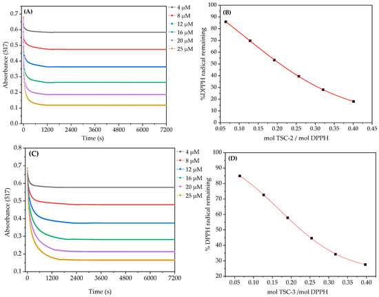 Reaction kinetics of DPPH radical with TSC-2 (A) and TSC-3 (C); %DPPH radical remaining at infinite time at the different concentration of TSC-2 (B)and TSC-3 (D).