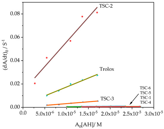 By analyzing the data as described in the experimental portion, the EC50 (mol AH/mol DPPH), stoichiometric factor(n) and the bimolecular rate constants(kb) were procured (Table 1), which are important parameters to consider when investigating antioxidants. Trolox was used as a reference in the DPPH kinetic assay. Regarding stoichiometric factor (n), the four tested compounds TSC-1, TSC-4, TSC-5, and TSC-6 have stoichiometric factors ranging from 1.21 to 1.44. The Trolox has a stoichiometric factor of 1.86. TSC-2 and TSC-3 had higher stoichiometric factor values of almost the same value—2.27. As illustrated in Figure 4, the increased linearly with A0[AH]. From the slope of a linear plot of against A0[AH], the bimolecular rate constants (kb) for the radical scavenging reaction were determined and presented in Table 1.
