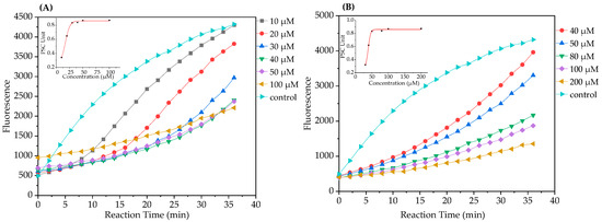 Time kinetics plots of TSC-2 (A) and TSC-3 (B) inhibition of non-fluorescent dichlorofluorescein (DCFH) oxidation by 2,2′-azobis(2-amidinopropane) dihydrochloride (AAPH). (the inset is dose-response plots).