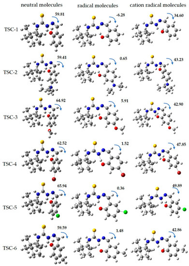 In order to evaluate the activity of an antioxidant via the hydrogen donating mechanism, bond dissociation enthalpy (BDE), which is related to the ability to donate a hydrogen atom, is assessed. The lowest BDE is defined for the relevant position where the easiest hydrogen atom abstraction for free radical scavenging reaction can take place [29,42]. The BDE values of molecules were calculated by using the B3LYP/6-31G(d) level of theory. There are three possible hydrogen bond breaking sites in our compounds, and the corresponding BDE values are listed in Table 2. The BDE values of N-H are in the range of 98.41–98.84 kcal/mol, significantly larger than the BDEs of N-H-N=C and O-H in molecules (80.86–86.54 kcal/mol). This indicates that the N-H is unfavorable to donating H atoms compared to the N-H-N=C and O-H groups. It is noteworthy that the calculated N-H-N=C and O-H BDEs of TSC-2 are 80.86 and 81.24 kcal/mol, respectively, which are far smaller than other compounds. This means that TSC-2 should have a stronger H-donating ability than other compounds; in other words, TSC-2 has the highest scavenging radical activity. The calculated result is consistent with the experimental result.