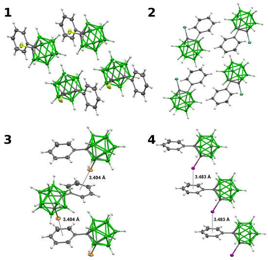 Icosahedral closo-1,2-C2B10H12, known as o-carborane, was found to have the positive part of its relatively large value of the experimental dipole moment, 4.50 D [1], in the midpoint of the C-C vector. When one of the hypercarbon atoms is substituted with phenyl (Ph), the dipole moment is even increased to 4.93 D. The difference between these two values was interpreted as a mesomeric contribution to the overall dipole moment as a consequence of the electron transfer from the benzene ring towards the icosahedral cage. This 1-Ph-closo-1,2-C2B10H11 was structurally studied by the techniques of gas-phase electron diffraction and X-ray diffraction in the gas phase and solid state [2]. When the second hypercarbon of the cage is substituted with halogens, the overall dipole moments in the series of 1-Ph-2-X-closo-1,2-C2B10H10 (X = F, Cl, Br, and I, denoted here as 1, 2, 3, and 4, respectively) decrease, in the case of F and Cl by more than 1 D due to the electron-withdrawing effect of these two halogen atoms [3]. The fact that the dipole moment of Br- and I-derivatives only decreased by 0.8 and even 0.2 D, respectively, was ascribed to the close position of halogen and Ph, and also to the partially positively charged outer part of the heavy halogen atoms, known as σ-holes [4]. A σ-hole can be characterized by its magnitude, VS,max, defined as the value of the most positive electrostatic potential (ESP) of an electron density surface. The higher the VS,max value, the more favorable the forming σ-hole interactions [5]. The halogen•••π interactions have been extensively studied in the solid state and evaluated theoretically by quantum mechanical calculations [6,7,8]. Recently, they have even been observed in solution [9]. The σ-hole interactions with aryls have been paid considerable attention in boron cluster chemistry as well, e.g., the S•••π interaction appears in 1-Ph-closo-1-SB11H10 [10].