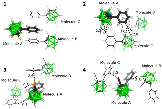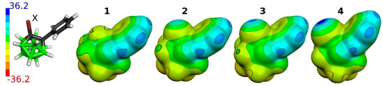 As the studied compounds are neutral and the halogen atoms are bound to a C-vertex, one can expect the heavier halogen atoms with highly positive σ-holes. The molecular ESP surfaces of the studied molecules were computed in order to validate this assumption (see Figure 3). Indeed, the top of the I and Br atoms with the VS,max values of 36.2 and 25.8 kcal mol−1, respectively, is the most positive part of the 3 and 4 molecules. In the case of 2, the σ-hole of the Cl atom has the VS,max value of 19.5 kcal mol−1. The H atoms of the Ph ring are thus more positive (VS,max value of 23.9 kcal mol−1). The F atom of 1 does not have a positive σ-hole (the VS,max value of −5.7 kcal mol−1) due to its large electronegativity. The most negative values (VS,min) of the molecular surfaces of the studied molecules are on BH(9) vertices, which are antipodal to CX(2) vertices. The VS,min values range from −14.0 to −12.9 kcal mol−1 (for 4 and 1 compounds, respectively). Besides hydridic BH vertices, the σ-holes on the heavier halogen can also interact with the π electrons of Ph rings, which have a negative ESP surface as well (the VS,min values range between −6.8 and −6.4 kcal mol−1 for 4 and 2 compounds, respectively).