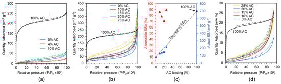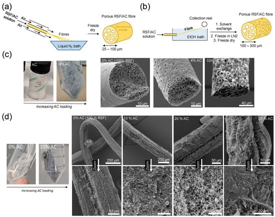 | Method | AC Loading [wt.%] | Average Fibre Ø [µm] | Average Macropore Ø [µm] | N2 BET SSA [m2·g−1] | Accessible SSA [%] | Micropore Vol. [cm3·g−1] | Max. Cyclohexane Uptake [w/w%] |