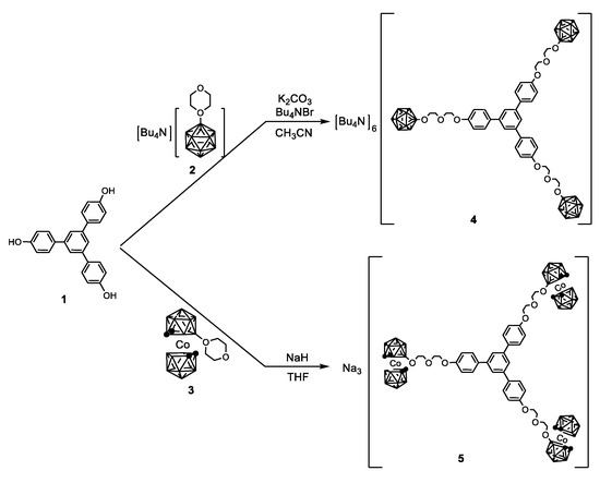 - Dash, B.P.; Satapathy, R.; Maguire, J.A.; Hosmane, N.S. Facile Synthetic Routes to Phenylene and Triazine Core Based Dendritic Cobaltabisdicarbollides. Organometallics 2010, 29, 5230–5235. [Google Scholar] [CrossRef]