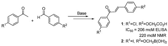Chalcone-based inhibitors were the first reported compounds of this type and they have been the most extensively studied [21,22,23,24]. Chalcone 1 (Figure 1) had an ELISA IC50 value of 206 µM and caused a shift in the pattern of the 1H-15N HSQC NMR spectrum of 15N-enriched MDM2, consistent with chalcone binding in the tryptophan pocket. A gel shift assay revealed that the p53 released from the p53/MDM2 complex by treatment with 1 was unable to bind DNA, suggesting an additional influence of the chalcone on the p53 protein.