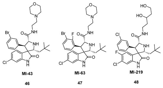 The synthesized compounds showed a significant cytotoxic effect on the prostate cancer cell line LNCap, with IC50 = 86 nM, and on the colorectal cancer cell line HCTwt, with IC50 = 22 μM. Based on this method, a large library of spiro derivatives was synthesized, the most active of which are shown in Figure 4. Compounds MI-43 (46), MI-63 (47), and MI-219 (48) showed excellent binding to the MDM2 protein (Ki~5.7 nM), and compound MI-219 (48) was recognized as a selective inhibitor of the p53–MDM2 interaction due to its ability to induce cell apoptosis in tumor cells without affecting healthy ones [39]. Upon an oral injection of compound 48 in xenograft models with the SJSA-1 grafted tumor line, the inhibition of tumor growth was 86% at a double dose of 200 mg/kg [40].