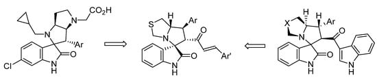 In 2019, Barakata and co-workers [41] synthesized a series of spiroindolinones using an asymmetric 1,3-dipolar reaction as the key step (Figure 5). Their investigation involved the design and synthesis of substituted spirooxindoles as potent MDM2 inhibitors, using an efficient 1,3-dipolar cycloaddition reaction [42,43]. The one-pot multi-component reactions of a α,β-unsaturated dienone derivative with substituted isatines and amino acid derivative (l-4-thiazolidinecarboxylic acid), and underheating in MeOH at 60 °C for 1.5–2.0 h, were conducted to generate the focused cycloadducts library, which had four stereogeneric centers with an excellent yield (69–89%).