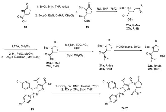 Scientists from Daiichi Sankyo reported the synthesis of compounds 24 and 25 using proline as the starting material (Scheme 3) [32]. Firstly, the reaction with alkyl lithium was carried out with the previous protection of amide and carboxylic groups. Then, the racemic pyrrolidine 22 was obtained in three stages.