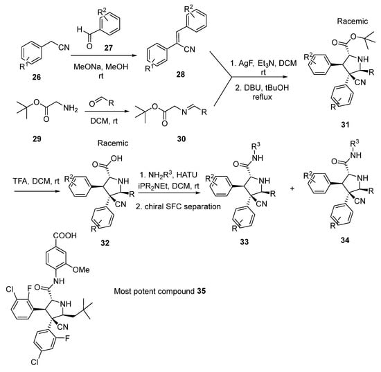 On the basis of the Nutlin-3a compound, the pyrrolidine-containing compound 32 was synthesized [33]. Starting from the condensation of benzyl cyanide derivatives 26 with aromatic aldehydes 27 in the presence of sodium methylate, and further imine addition, the racemic pyrrolidine derivative 31 was obtained. After Boc-deprotection by triflic acid and amine addition, the racemic amide 32 was formed and then separated by a chiral supercritical fluid chromatography (). The most potent compound 35 is shown in Scheme 4 [34,35].