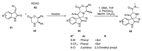 The most promising MDM2 inhibitor sare possibly the compounds obtained by Shaomeng Wang’s group from the University of Michigan [37]. Based on molecular docking data for these structures, the group proposed modeling the tryptophan fragment in the p53 protein with a spirooxindole fragment, which, due to its greater conformational rigidity, is able to provide a better affinity for the MDM2 protein. This class of compounds can be obtained as shown in Scheme 6, with high stereoselectivity. The condensation reaction of the aromatic aldehydes with oxindoles was initially carried out either in the presence of a base during boiling or using microwave radiation, to obtain E-3-aryl-1,3-dihydroindol-2-ones 41, which were further introduced into 1,3-dipolar cycloaddition reaction with aliphatic aldehydes 42 and optically active (5R,6S) -5,6-diphenylmorpholin-2-one 43 in toluene. The resulting product 44 was purified by column chromatography and then treated with a solution of dimethylamine in tetrahydrofuran and lead(IV) acetate to give amide 45 in a quantitative yield. The absolute configuration of the products was confirmed by X-ray diffraction data [38].