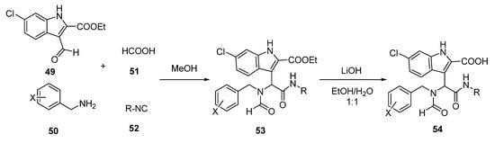 A series of compounds using the four-component Ugi reaction (Scheme 7) [44] were obtained. The four-component Ugi reaction was carried out by mixing equivalent amounts of ethyl 6-chloroindole-2-carboxylate 49, benzylamine 50, formic acid 51, and the corresponding isocyanide 52 in methanol. The resulting esters 53 were hydrolyzed to give the acid 54.