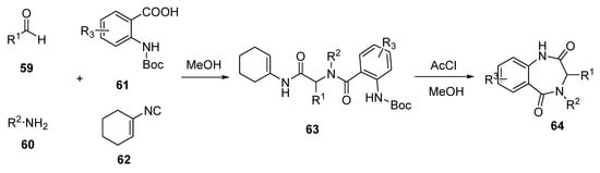 The pharmaceutical company Johnson and Johnson screened a library of 1,4-benzodiazepine-2,5-dione (BDP) capable of binding to the p53 domain of the MDM2 protein. These compounds can be obtained in two stages (Scheme 9), with the initial multi-component Ugi reaction between equimolar amounts of aldehyde 59, amine 60, Boc-protected anthranilic acid 61, and 1-isocyanidecyclohexane 62 in methanol, to obtain the product 63, which then forms target cyclic product 64 under the action of acetyl chloride [47]. The most active compound of this group is the enantiomer containing the para-chlorophenyl group at R1, an α-carboxybenzyl group at R2, and an iodine atom at R3; this compound has a binding constant with the MDM2 protein of Kd = 80 nM.
