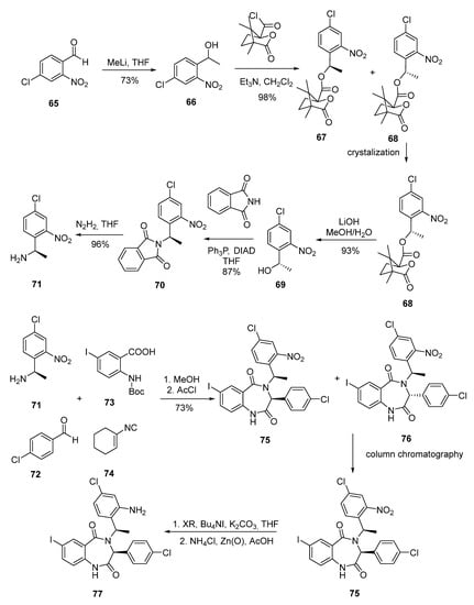 In the next investigation step, Johnson and Johnson undertook an enantioselective synthesis of the benzodiazepine compounds of the BDP series (Scheme 10). Compound 65 was initially introduced into an alkylation reaction with methyl lithium to form a racemic secondary alcohol 66, which reacted with camphoric acid chloride to form a mixture of two diastereomers. This mixture was then recrystallized to isolate ester 68 as a single stereoisomer, which was then hydrolyzed and introduced into a Mitsunobu reaction with phthalimide, and the phthalimide protection was then removed with hydrazine to form amine 70. This amine was used in the Ugi reaction, followed by cyclization, described above, and the mixture of diastereomers was then separated by column chromatography, after which alkylation at the nitrogen atom yielded the necessary compound 71 [48], the structure of which was confirmed by X-ray diffraction.