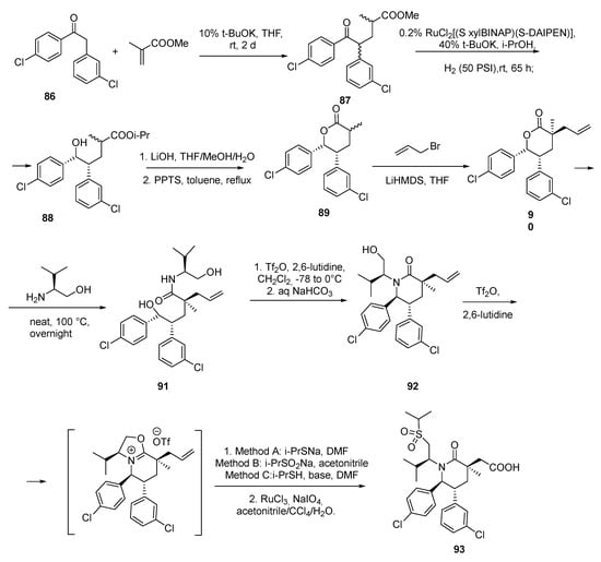 A piperidinone compound AMG 232 (93) was synthesized using the Michael condensation of ketone 86 and methacrylic acid ester, to get compound 87. Then, reduction and ester formation with further cyclization at base conditions allowed cyclic lactone 89 to be obtained. The subsequent alkylation with allyl bromide and the reaction of the lactone opening by an amine derivative gave the chiral amide 91, which was then cyclized to epypiperidinone 92 (Scheme 12) [52,53].