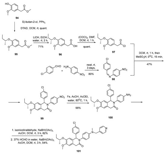 A representative synthesis for compound 101 is described in Scheme 13. The commercially available methyl 2-(4-hydroxy-3-methoxyphenyl)acetate was subjected to a Mitsunobu reaction with (S)-butan-2-ol, using diethyl azodicarboxilate (DEAD) and triphenylphosphine as the reagents, to deliver the sec-butyl ether 95 as its pure (R)-enantiomer. The methyl ester 95 was hydrolyzed with LiOH into the corresponding carboxylic acid 96, and then reacted with oxalyl chloride to give the acyl chloride 97 in quantitative yields. The cycloaddition reaction of 97 with the imine 98, obtained from the condensation of the commercially available 4-chlorobenzaldehyde and 4-nitroaniline, led to the dihydroisoquinolinone analog 99, with no stereo selectivity observed for the newly created asymmetric center. The nitro group of 99 was reduced with iron following classical reaction conditions, to give the corresponding aniline 100 in nearly quantitative yields. Finally, the aniline functionality underwent two consecutive reductive aminations with isonicotinaldehyde and formaldehyde, respectively, using NaBH(Oac)3 as a reducing agent, to deliver compound 101 as a mixture of two diastereoisomers. At that point, the separation of the diastereoisomeric pair could not be achieved by classical normal phase or reversed phase chromatography and required the use of chiral chromatography conditions.
