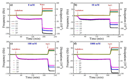 Figure 1 shows the frequency and dissipation variation during the asphaltene injection, pure solvent rinsing, and brine injection. F3, F5, F7 and D3, D5, D7 represent the frequency and dissipation curves corresponding to different overtones, respectively. When the frequencies and dissipation curves under different overtones coincide, it means that a rigid adsorption layer is formed. On the other hand, if they do not overlap, it means that the formed adsorption layer is loose. Resonance frequency represents the information of the adsorbed mass on surface, and energy dissipation provides the information of the elastic property of the adsorbed film, from which frequency decrease means asphaltene adsorption and dissipation increase means loose adsorption conformation. [21,22]. A decrease of 25–35 Hz in frequency and an increase of 2–3 × 10−6 in dissipation are obtained due to the asphaltene adsorption in all cases, indicating the reproducibility and credibility. Negligible variations of frequency and dissipation values at different overtones are also found during the injection of asphaltene, indicating the formation of rigid films in line with previous reports [12,23]. After the adsorption equilibrium, the surface is rinsed by pure solvent toluene, and then the aqueous solution is introduced which triggers sharp changes in both frequency and dissipation, in the formation of swelling adlayers. This is largely due to the liquid loading effect as a result of differences in viscosity and density between toluene and water [24].