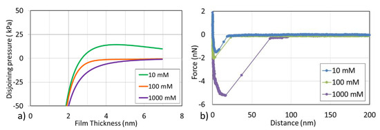 Here, disjoining pressure was used to characterize the interaction forces in the asphaltene-brine-silica system. Positive disjoining pressure means repulsive forces between asphaltene and silica in the brine, suggesting a relatively water-wet system, whereas negative disjoining pressure means attractive forces between asphaltene and silica in the brine, implying a relatively oil-wet system [26]. Our calculations indicate that with the decrease in brine concentration, disjoining pressure changes from negative to positive, which implies that lowering salinity likely shifts an oil-wet system to a water-wet system (Figure 2a). For example, in the presence of 1000 mM and 100 mM NaCl, disjoining pressure is negative and monotonically decreases with decreasing separation distance. For 10 mM NaCl, the disjoining pressure exhibits a positive value indicating the presence of repulsion. It is worth noting that the decrease in salinity triggers the outward expansion of the electrostatic double layer, resulting in an increase in electrostatic repulsion [27]. The disjoining pressure calculation reasonably explains the above zeta potential experimental results, implying that lowering salinity induces more negative zeta potential of asphaltene-brine and brine-silica interfaces, resulting in the repulsive force and water-wet system.