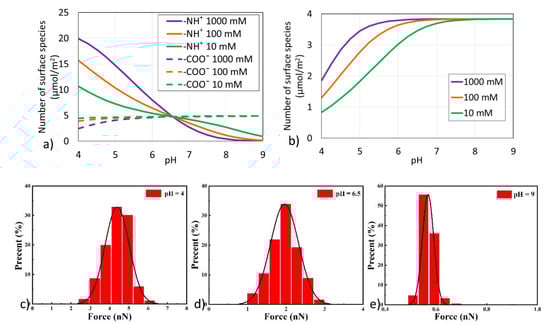 Effect of pH on (a) Number of surface species at asphaltene surfaces and (b) Number of surface species at silica surfaces in the presence of various salinities, and Adhesion forces of asphaltene-brine-silica systems in the presence of 100 mM NaCl at (c) pH 4, (d) pH 6.5, and (e) pH 9.