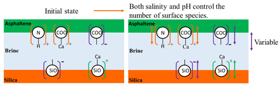 Moreover, the interaction of the asphaltene-brine-silica system is also thought to be governed by thermodynamics [26,27,28,29], which can be depicted using DLVO theory, together with electrostatics, [23,30,31,32], which can be described using surface complexation modelling. In order to understand how the surface species at asphaltene-brine and brine-silica interfaces impact the interaction of asphaltene-brine-silica system, a geochemical study was performed in the following subsection.