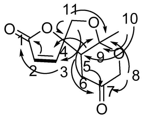 Compound 3 was determined to be C11H12O5 from its NMR spectrum and HR-ESI-MS. Analysis of its DEPT data exhibited one lactone carbonyl (δC 168.7), one ketone (δC 204.9), and two olefinic carbons (δC 124.1 and 152.3), so 3 has a tricyclic ring system. The structure of 3 (Figure 3) was confirmed by HMBC spectrum from H-10 to C-5, C-9; from H-8, H-6,H-11 to C-9; from H-11 to C-4; from H-5, H-6, H-8 to C-7; from H-5, H-11 to C-3; from H-2, H-3 to C-1. The relative configurations of 3 at H-5 and H-9 were determined by the nuclear overhauser enhancement spectroscopy (ROESY) correlations between H-5 and H-10. The absolute configuration of 3 was determined by comparing the circular dichroism spectrum with that of its analog, streptoglyceride A [14].