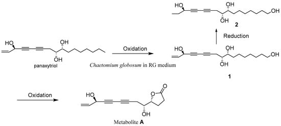 In our previous work, some active compounds such as panaxytriol from RG indicated inhibition against the merisis of C. globosum, and C. globosum may own a detoxication mechanism against the antifungal activity of active compounds [11]. Panaxylactone (metabolite A) biotransformed from panaxytriol exhibited no antifungal activity, suggesting that C. globosum can transform panaxytriol to panaxylactone with less antifungus activity than can panaxytriol for its own merits. The biotransformation of panaxylactone was not clear, so the investigation of the intermediates in the biotransformation of natural polyacetylene by adjustment of fermentation mode was carried out. Two new key intermediates (1, and 2) were isolated, and the metabolism process of panaxylactone was shown in Figure 4. The natural 1-hydroxydihydropanaxacol from ginseng like the structure of 2, except for one more ω-hydroxy at 2, had S configuration at C-3 [15], and 2 had R configuration at C-3, so 2 was mostly transformed from 1. Compound 1, 2, and 3 also exhibited no antifungal activity with MICs > 256 μg/mL against C. globosum, which gave more proof on the detoxication mechanism of C. globosum against the antifungal activity of polyacetylenes from RG. Numerous bioactive polyacetylenes were found in the plant Panax ginseng. Among these compounds, PXT was shown in vitro cytotoxic activity against a series of human tumor cells [13]. Compound 1, 2 indicated no cytotoxicity with a concentration of 40 μM. Based on the LC-MS test (Figure S25), the new compound 2 was exhibited to be non-mark in RG extract, but mark in FRG, so compound 2 was obtained by microbial fermentation. Through these results, it was found that the changes in the chemical structure of PXT can decrease the antifungal activity and cytotoxicity. Compounds 1 and 2 indicated significant inhibition against NO production, with ratios of 44.80 ± 1.37 and 23.10 ± 1.00% at 50 μM. So, pathogen C. globosum might possess the potential of bioactivity modification upon the polyacetylenes from RG. The novel skeleton, like 3, was only found in basidiomycete Lenzites betulinusrare and Streptomyces, but not from plants [14,16]. 3 was positive in FRG by LC-MS, but negative in RG and liquid medium of C. globosum, so 3 should be produced by C. globosum, and this skeleton was first found in the generous Chaetomium metabolites. Thus, the chemical constituents of RG extract can induce the production of rare 6/5/5 tricyclic ring spiro-γ-lactone skeleton (3) from Chaetomium.