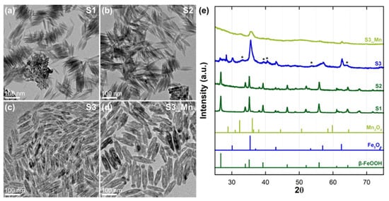 Conventional TEM imaging of the samples: (a) S1; (b) S2; (c) S3; (d) S3_Mn. Panel (e) reports the XRD pattern of all samples. The * symbol in the S3 sample’s XRD pattern indicates the peaks coming from hematite residuals.