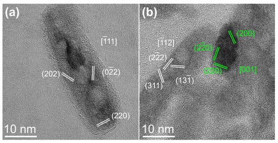 HRTEM imaging of: (a) S3 and (b) S3_Mn. Magnetite lattice planes are indicated in white, while those of hausmannite (Mn3O4) are indicated in green.