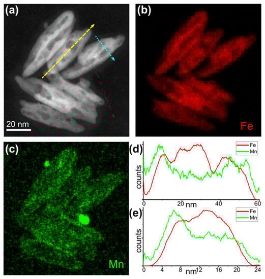 In this regard, the possible presence of “open” pores in the NRs should in principle foster an increased content of Mn due to the increased surface made available, and to the thinner internal NR volume in the zones near them, which might in turn promote a higher local defectivity and, consequently, an easier path for the deeper penetration of the CE front towards the inner portion of the NRs. The resulting NRs would consequently be inhomogeneous in terms of Mn content, with Mn-richer zones forming in correspondence with the open pores and determining an overall “patched” distribution of Mn in the elemental maps. Conversely, the distribution of Fe and Mn in the elemental maps shown in Figure 3 follows the variations in brightness of the HAADF-STEM images. Thus, given the similarity between Mn and Fe in terms of Z-contrast, this means that the brighter zones correspond mainly to thicker ones. Furthermore, no major variation in Mn content can be observed in correspondence with the pores. These results suggest that the nanopores formed during the reduction of NRs are indeed internal and completely isolated from the external surface, hence they do not act as a second CE front for Mn.