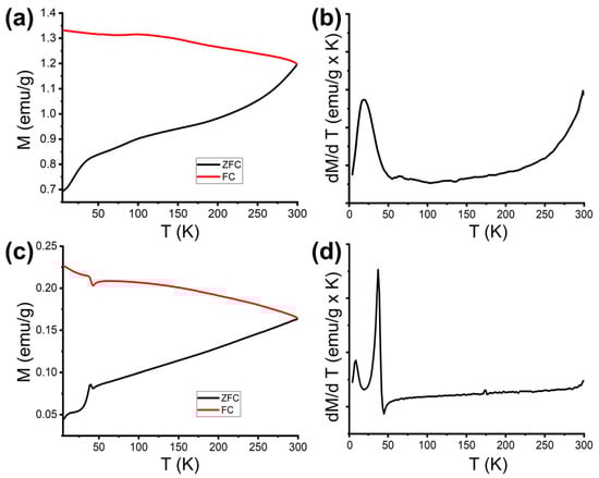 Zero-field-cooled/field-cooled (ZFC-FC) magnetization curves and their derivative of samples S3 and S3_Mn: (a) ZFC-FC curves of S3, (b) derivative curve (d(MZFC–MFC)/dT vs. T) of sample S3, (c) ZFC-FC curves of sample S3_Mn; (d) derivative curve (d(MZFC–MFC)/dT vs. T) of sample S3_Mn.
