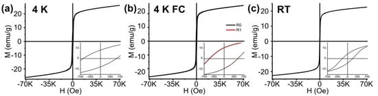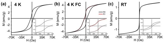 Hysteresis loops of sample S3_Mn with maximum applied field equal to 70 kOe. The insets show the low field regions of each loop. (a) Hysteresis recorded at 4 K; (b) Hysteresis recorded at 4 K after cooling under an applied field equal to 70 kOe. R0 indicates the hysteresis recorded after cooling, R1 refers to the hysteresis recorded immediately after the first one; (c) Hysteresis recorded at RT.