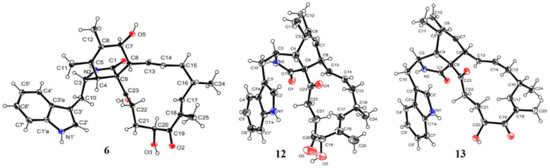 Additionally, the structures of these known compounds (2‒16) were mainly elucidated by spectral data analysis as well as comparison with those reported in the literature. They were identified as chaetoglobosins A‒G (2‒8) [16,17,18], aureochaeglobosin B (9) [6], isochaetoglobosin D (10) [18], chaetoglobosin Fex (11) [16], penochalasin G (12) [19], armochaetoglobin G (13) [7], prochaetoglobosin I (14) [8], chaetoglobosins Vb (15) [8] and Y (16) [18], respectively (Figure 1). Structurally, they shared a 3-substituted indole moiety and a 13-membered carbocyclic ring system with characteristic UV absorptions at around 205, 220, and 275 nm. Among them, aureochaeglobosin B was recently reported as a rare [4 + 2] cycloaddition heterodimer of chaetoglobosin and aureonitol. Of note, the X-ray single crystal structures and absolute configurations of chaetoglobosin E, penochalasin G, and armochaetoglobin G were firstly incontrovertibly confirmed by single-crystal X-ray crystallography herein (Figure 3).