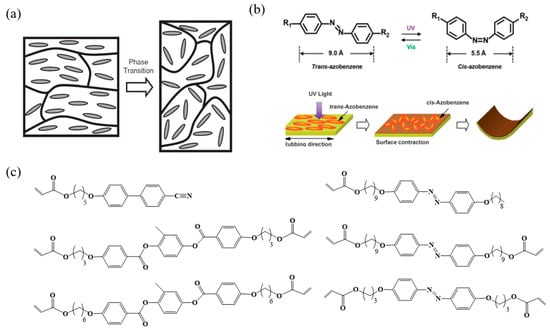 The basic principle behind the shape change of LCPs depends on alignment directions and relevant phase transitions (nematic, cholesteric, smectic, or isotropic) [3]. The majority of studies on the actuation of LCPs based on thermally induced order–disorder phase transition are illustrated in Figure 1a [2,12]. Materials exhibit anisotropic deformation along the director orientation as the order parameter (S) change above the phase transition temperature. For another photoinduced type, such as azobenzene-containing LCPs, the stabilized rod-like trans azobenzene mesogens transfer to unstable bent cis isomers irradiation with UV light, resulting in the decrease of the order parameter. Then, the volume shrinkage in the film surface cause bending behavior (Figure 1b) [13]. Based on the mechanisms, the widely studied monomers are adopted to fabricated LCPs illustrated in Figure 1c [2,3,11,14,15].
