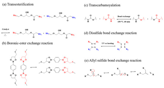 Dynamic covalent exchangeable bonds in LCPs. (a) Transesterification. [47] (b)Boronic-ester exchange reaction [49]. (c) Transcarbamoyalation [48]. (d) Disulfide bond exchange reaction [50]. (e) Allyl sulfide bond exchange reaction [53].