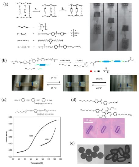 Thermal responsive LCPs exhibit shape change along the director orientation as the order parameter changes by the heating above and cooling below the phase transition temperature. Contraction and expansion behaviors of LCPs driving by direct heating and cooling along the aligned orientation director is shown in Figure 3. The first reported monodomain LCP was prepared by Finkelmann et al. using a two-step crosslinking method depending on the react speed of C=C double bonds of vinyl groups and methacrylate groups to the Si-H of polyhydrosiloxane chain. A shape change in length of 90% parallel to the alignment direction was obtained during the nematic–isotropic phase transition [16]. A reversible actuation of an LCP film can lift up and put down a 10 g weight when heating and cooling (Figure 3a) [56]. In our previous work, we fabricated a monodomain LCP synthesized by a commercial liquid crystal monomer RM82 via thiol-Michael reaction. This material shows independent isotropic−nematic and nematic−smectic phase transitions. A single system possessed two-way reversible strains and multiple shape memory effects (Figure 3b) [48]. In Figure 3c, Ratna et al. reported side chain polyacrylate LCPs that exhibit strains of 35–45% to the stresses of 210 kPa. These muscle-like materials have potential possibility to design artificial muscle actuators (compared to muscle shrinkage stress of 300 kPa) [27]. In addition to the macro-sized system, micro- or nano-sized actuators are desirable for practical application. Keller et al. utilized a soft lithography technique to prepare micron-sized responsive liquid crystal pillars [35,57]. The pillars underwent a reversible contraction and expansion in the order of 30–40% when heating and cooling (Figure 3d). A similar micrometer-size actuator was shown in Figure 3e synthesized by Zental et al. via the microfluidic method. The particles consisting of monodomains showed a reversible change in length of about 70% [36].